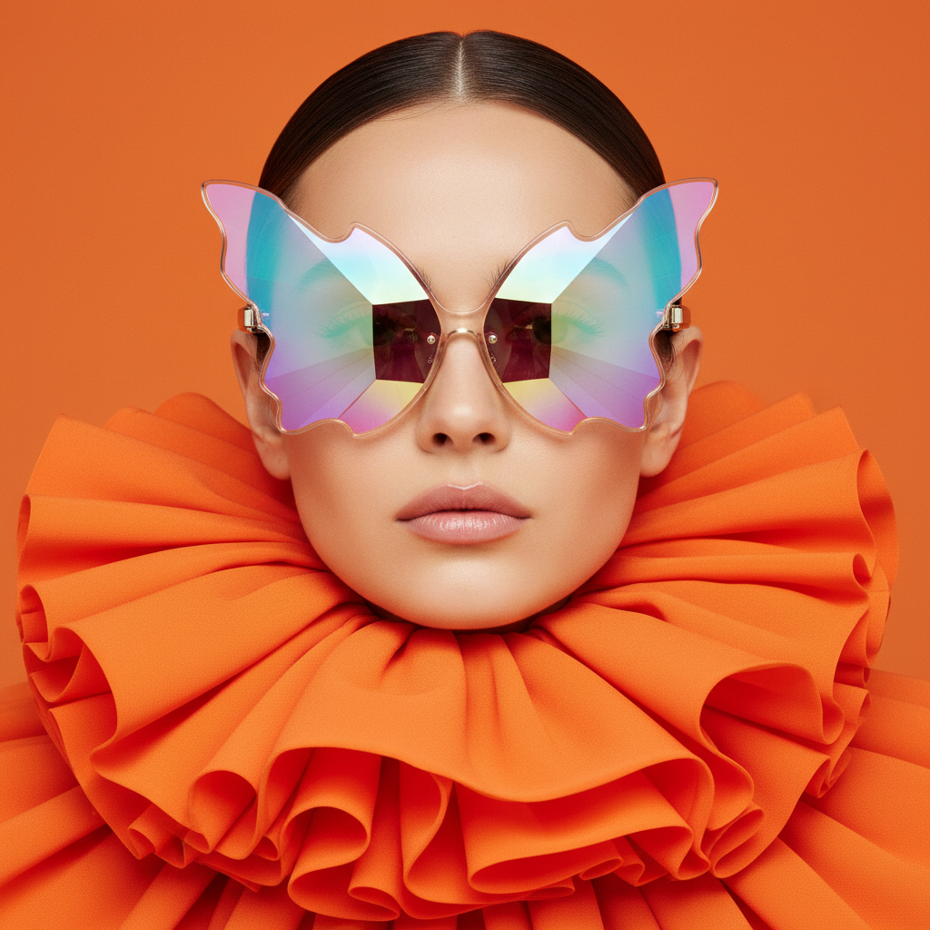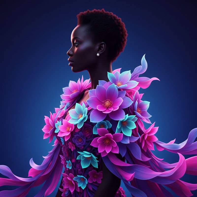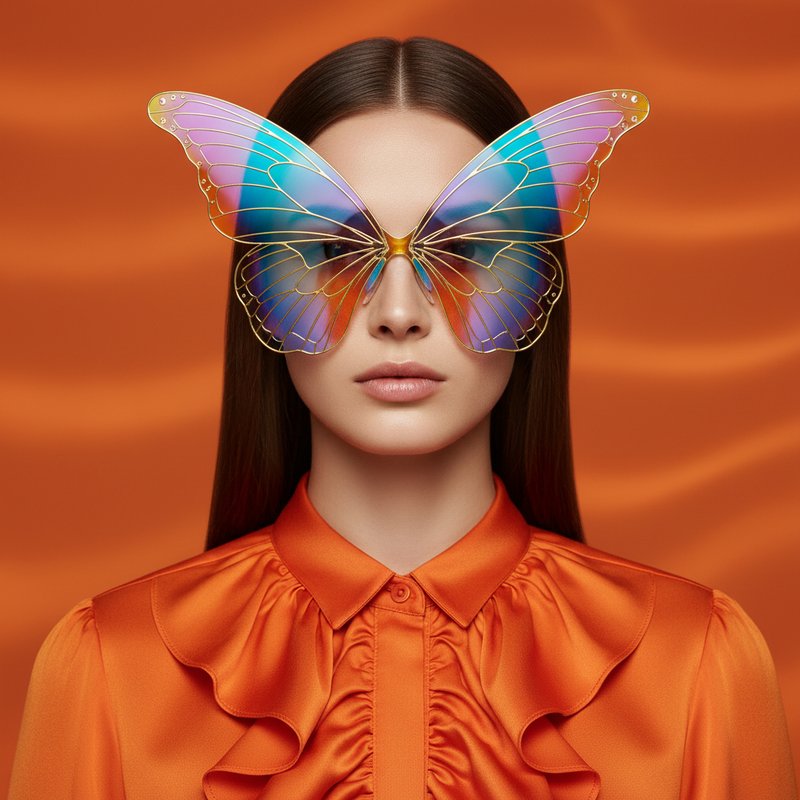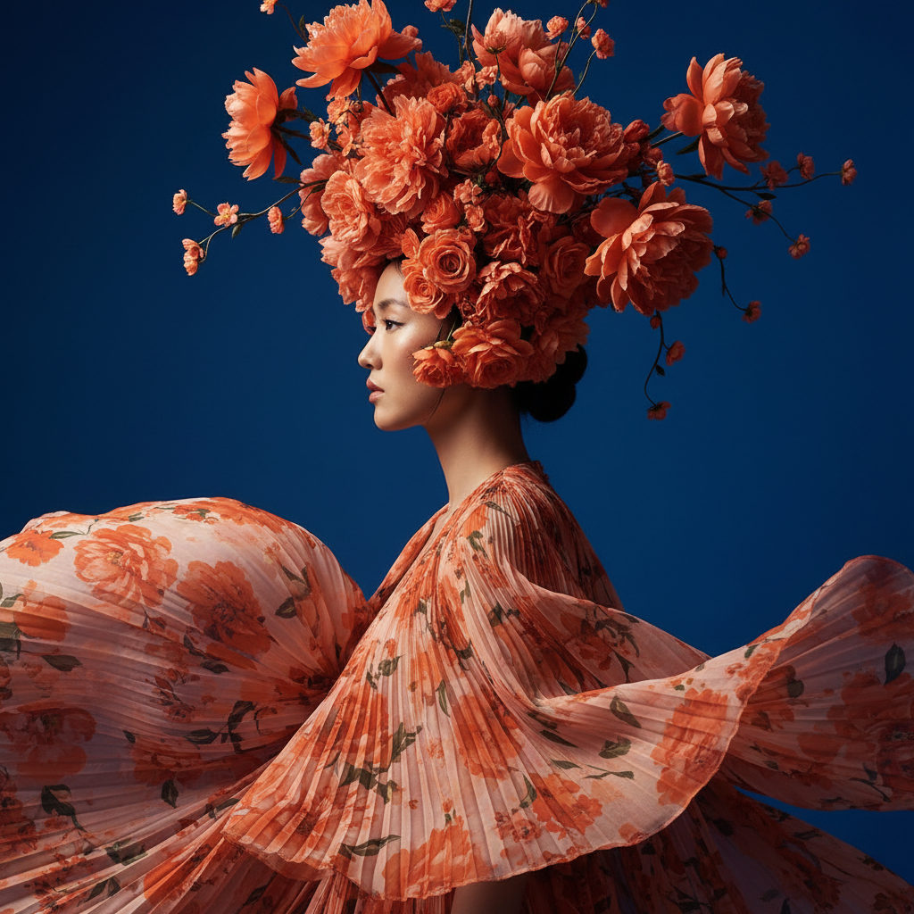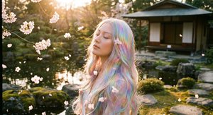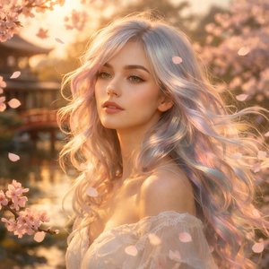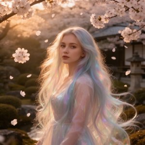 A dreamlike portrait of a woman with flowing iridescent hair, soft golden hour light casting gentle shadows, surrounded by floating cherry blossoms in a serene Japanese garden.