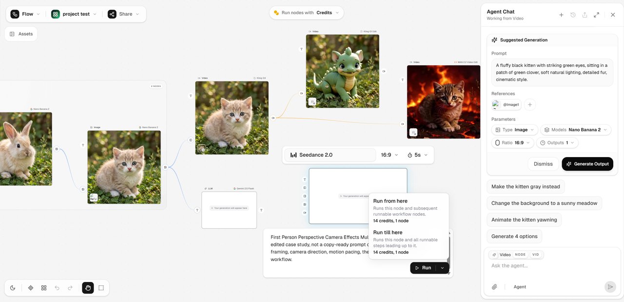 The Agent is a planner, not a wrapper around one model. It reads your intent, picks between the image and video models we support, and chains them when the task needs more than one step. Product shot? Image model. Ten-second clip? Video model. Full campaign? Both, in sequence.