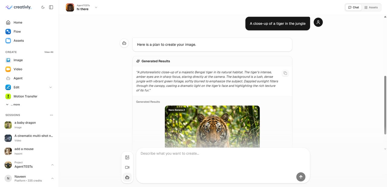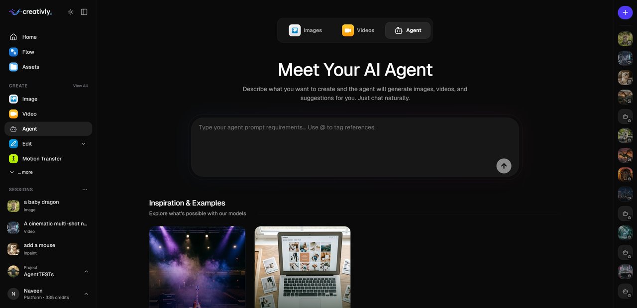 Creativly's two primary workspaces are Sessions (image, video, agent) and Flow (the node canvas). The Agent is native to both.