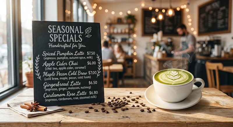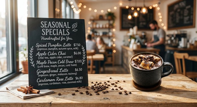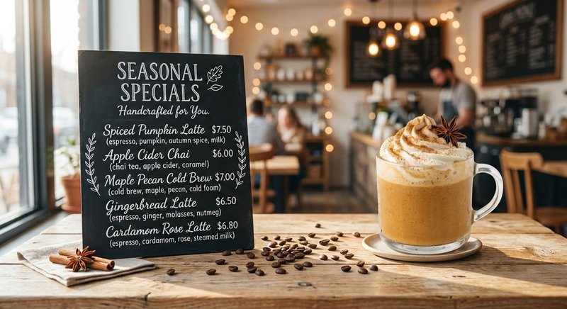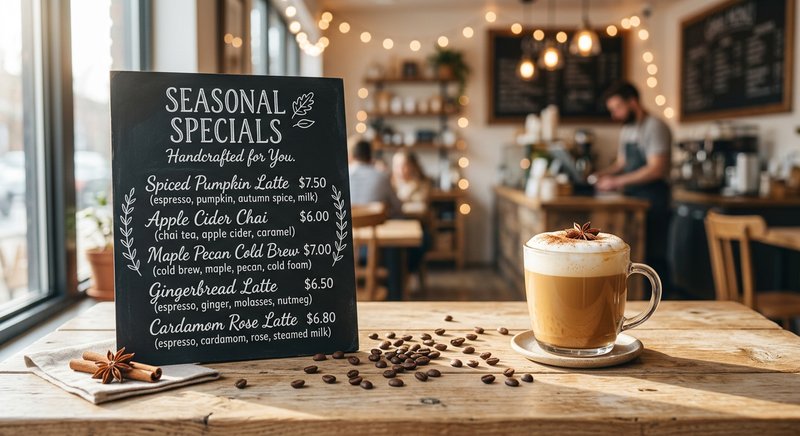 "A warm, inviting cafe interior photograph. A wooden counter in the foreground with scattered coffee beans and cinnamon sticks as props. On the left, a black chalkboard menu sign reading “SEASONAL SPECIALS — Handcrafted for You” with a handwritten list of drinks and prices: Spiced Pumpkin Latte $7.50, Apple Cider Chai $6.00, Maple Pecan Cold Brew $7.00, Gingerbread Latte $6.50, Cardamom Rose Latte $6.80. On the right side of the counter, a warm latte in a glass mug with foam art. Soft bokeh cafe background with warm ambient lighting. Cozy autumn cafe aesthetic, professional food photography, 16:9 wide format."