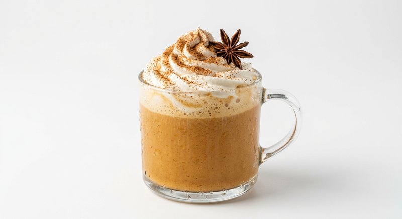 "Product photography of a pumpkin spice latte in a clear glass mug on a clean white background. Topped with whipped cream, a star anise, and cinnamon powder dusting. Warm autumn tones. Clean studio lighting, food photography."