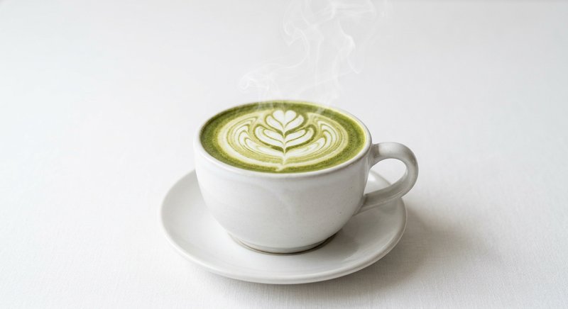 "Product photography of a matcha latte in a white ceramic cup and saucer on a clean white background. Vibrant green with delicate leaf latte art pattern, gentle steam rising. Clean studio lighting, food photography."