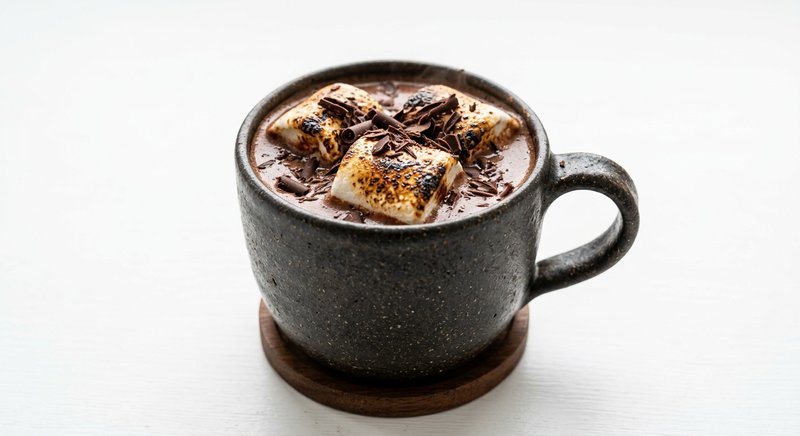 "Product photography of hot chocolate in a dark charcoal ceramic mug on a small wooden coaster, clean white background. Topped with toasted marshmallows and chocolate shavings. Rich dark brown tones. Clean studio lighting, food photography."