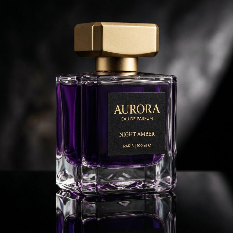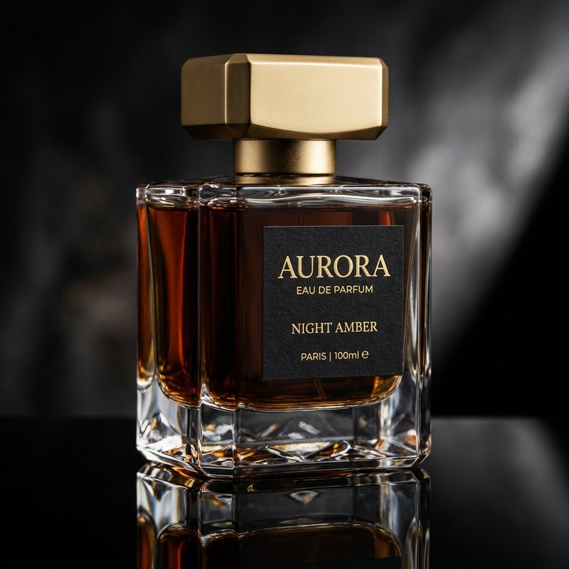 "A premium perfume bottle with a heavy crystal-cut glass base, dark amber liquid inside, and an angular matte gold cap. Minimalist black label with gold serif text. On a black reflective surface. Studio lighting with dramatic highlights on the crystal facets. Ultra high-quality product photography."