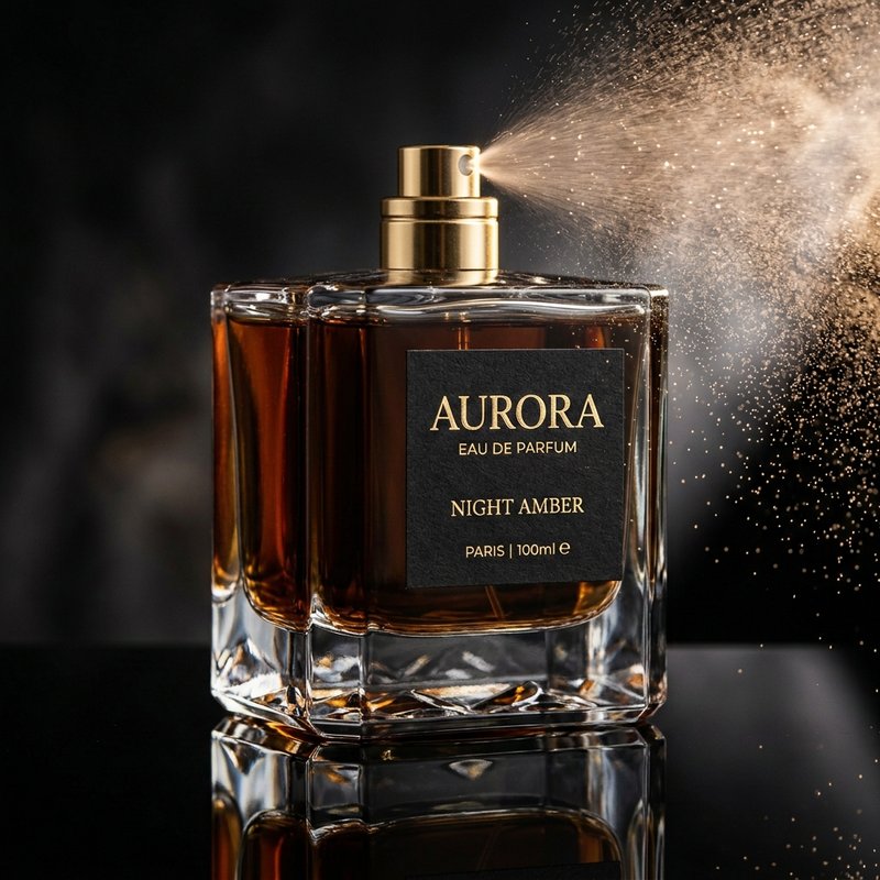 "Edit this perfume bottle: add a fine mist spray coming from the nozzle with light catching the droplets. Same bottle."