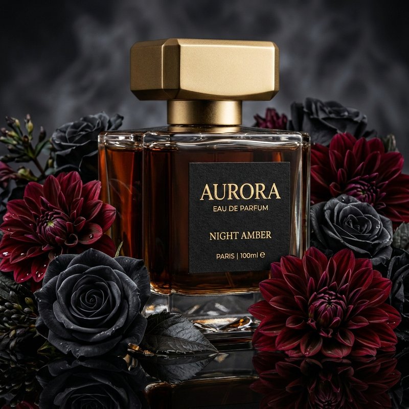 "Edit this perfume bottle: place it among dark moody flowers - black roses and deep red dahlias. Same bottle."