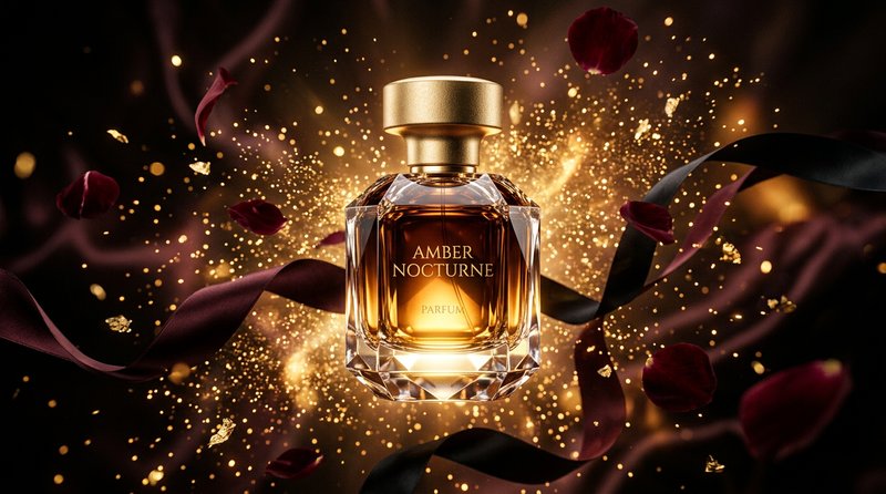"A premium crystal-cut perfume bottle with dark amber liquid and matte gold cap floating center frame surrounded by a burst of golden light particles, dark silk ribbons, and scattered rose petals frozen mid-air. The bottle glows with warm amber light from within. Luxurious, aspirational, the final reveal of a perfume commercial. Ultra high-quality cinematic frame."