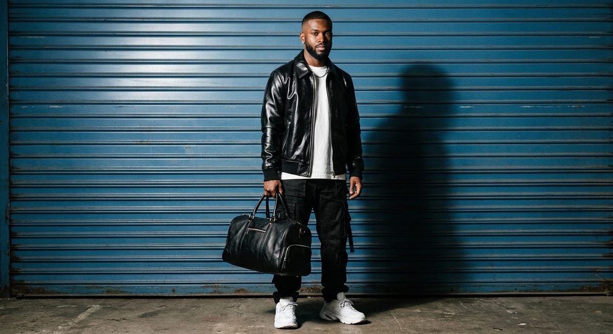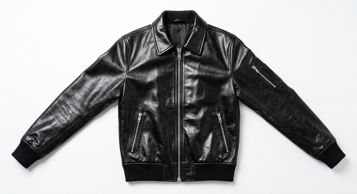 "The same person from the first image now wears the jacket from the second image, zipped halfway with collar popped. Everything else stays identical — same background, same lighting, same pose, same other clothing. The leather catches the studio light with a glossy sheen."