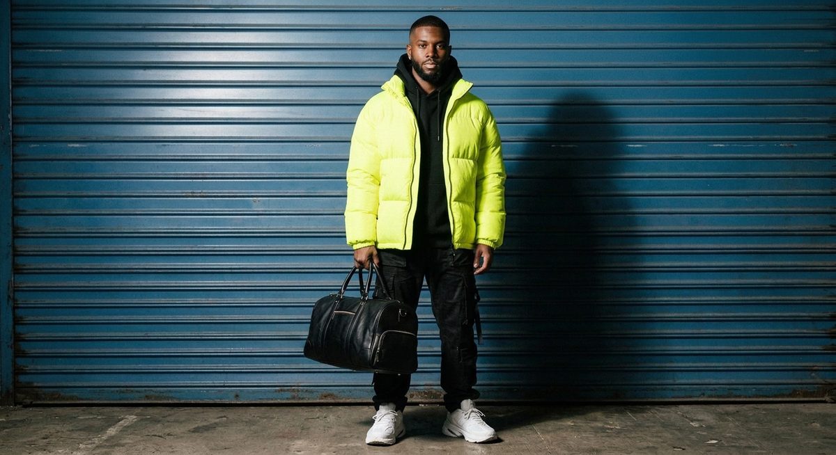 "The same person now wears a neon yellow oversized puffer jacket, unzipped over a black hoodie. Same background, same lighting, same pose. The neon yellow fabric pops against the blue wall. High-contrast lighting emphasizes the puffy quilted texture."