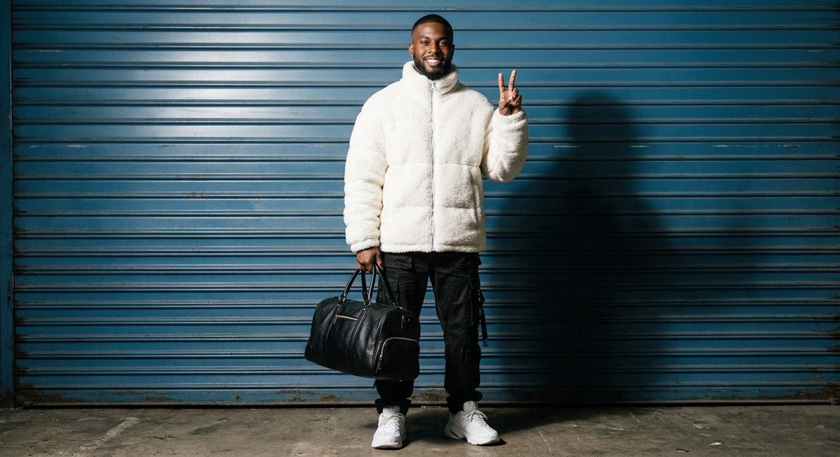 "The same person now wears a white fuzzy sherpa puffer jacket, zipped up to the chin. He flashes a peace sign and smiles warmly. Same background, same lighting. The white sherpa texture glows under the high-contrast studio light."