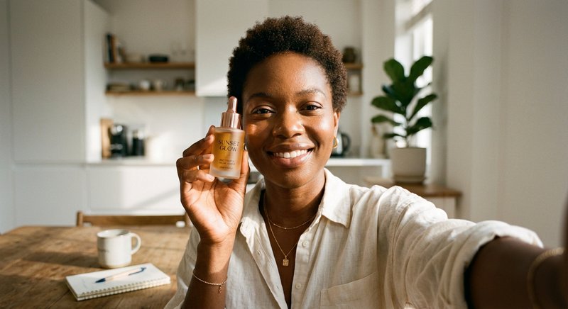 "Close-up UGC selfie video of a Black woman in a bright kitchen holding up a SUNSET GLOW serum bottle to camera, natural light, authentic social media energy, slight movement."