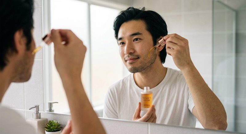 "Close-up of the man applying serum with the dropper on his jawline, looking in the mirror. Clean bathroom setting, soft light. Natural skincare routine moment."