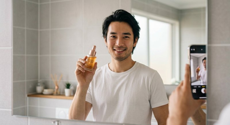 "Create a casual bathroom mirror selfie where he is holding the serum bottle up with one hand, other hand taking the photo. Modern bathroom setting, soft diffused light. Authentic male skincare UGC energy."