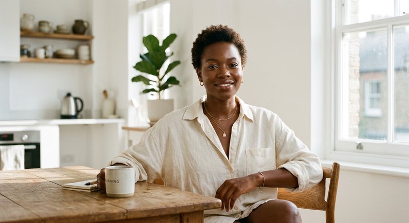 "A photorealistic portrait of a 30-year-old Black woman with glowing deep brown skin, short cropped natural hair, warm brown eyes, and full lips. She is wearing an oversized cream linen shirt unbuttoned at the collar. Morning light streaming through a window hits her face from the right side. She is sitting at a wooden kitchen table in a bright, airy minimalist apartment. Shot on 35mm, shallow depth of field, warm natural tones, 8k resolution."