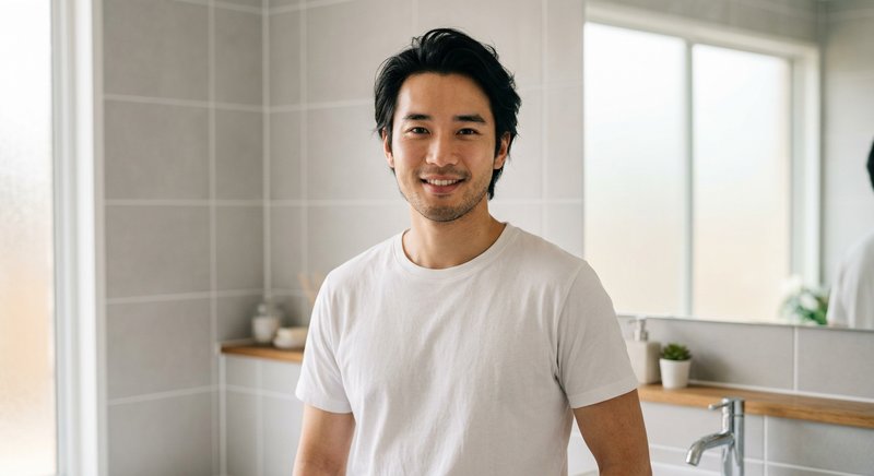 "A photorealistic portrait of a 24-year-old East Asian man with clear smooth skin, a subtle healthy glow, and relaxed expression. He has medium-length black hair swept back loosely. Wearing a simple white crew-neck t-shirt. He is in a modern bathroom with soft diffused lighting from frosted glass, clean white tiles behind him. Shot on 50mm, natural skin texture, warm tones, 8k resolution."