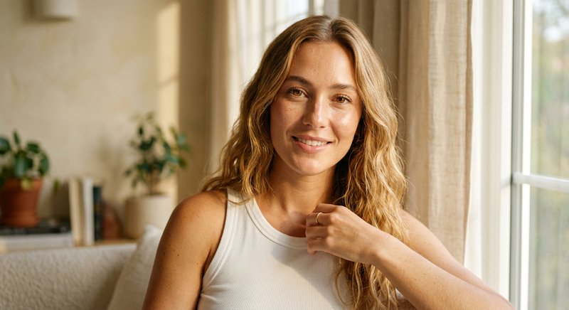 "A photorealistic portrait of a 26-year-old woman with a natural clean girl aesthetic, sun-kissed skin with light freckles, and a healthy dewy glow. She has shoulder-length wavy honey-blonde hair and warm amber eyes. She is wearing a simple white ribbed tank top. Soft golden hour lighting hitting her face from the side, shot on 35mm lens, 8k resolution, cinematic skin texture, soft cream-colored indoor background."