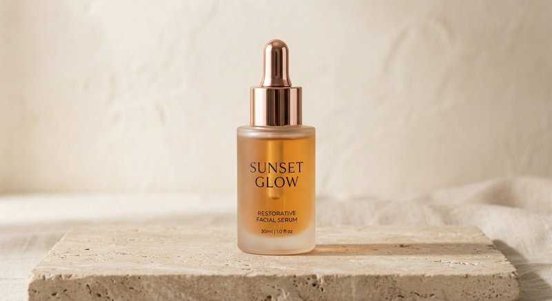 "Professional studio product photography of a luxury facial serum bottle. The bottle is made of premium frosted translucent glass with the brand name “SUNSET GLOW” printed in minimalist black serif typography. The cap is a high-shine metallic rose gold dropper. The bottle is set on a neutral beige stone surface with soft, elegant shadows and high-end lighting."