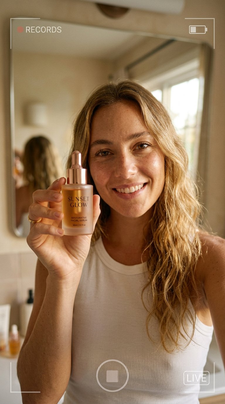 "Close-up UGC selfie video of a young honey-blonde woman holding up a SUNSET GLOW serum bottle to camera, warm golden light, authentic social media energy, slight movement."
