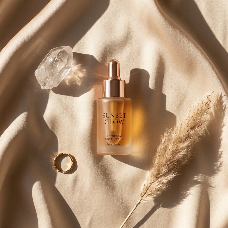 "Aesthetic overhead flat-lay shot. The SUNSET GLOW serum bottle is placed on a piece of draped champagne silk fabric. Surrounding props include a small piece of raw quartz crystal, a sprig of dried pampas grass, and a thin gold ring. Harsh direct sunset sunlight creates long, trendy shadows across the composition. Minimalist, high-fashion editorial aesthetic. Square 1:1 composition."